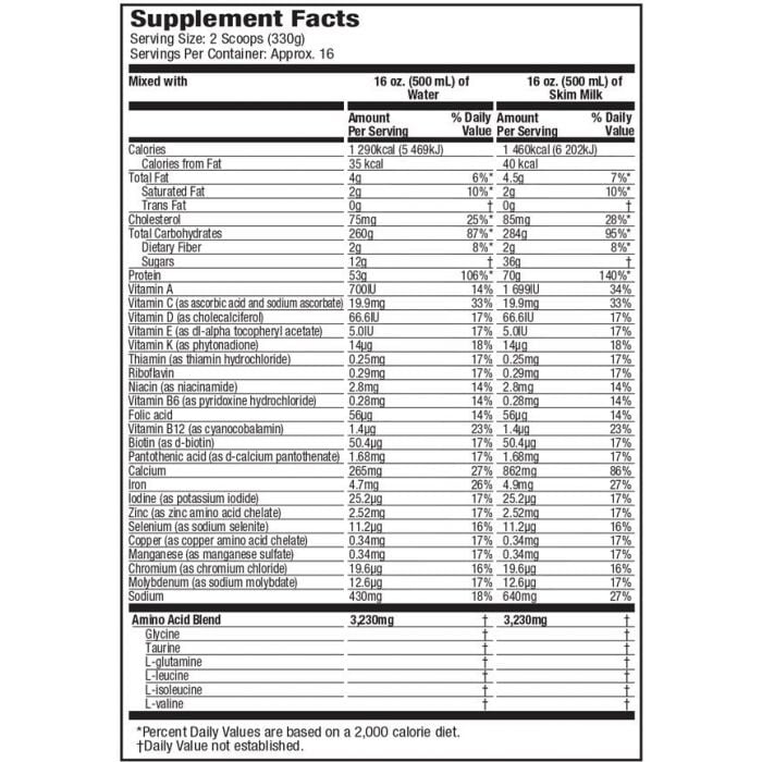 100% Premium Mass Gainer hilft Ihnen dabei, Ihren Kalorienbedarf zu decken, indem es 1270 Kalorien liefert, darunter 50 Gramm hochwertiges Protein und 261 Gramm Kohlenhydrate, um Energie in jeder Portion bereitzustellen. Es ist mit wichtigen Vitaminen, Mineralstoffen und einem kompletten Spektrum an Aminosäuren ausgestattet, die beim Muskelaufbau und Kraftaufbau helfen.