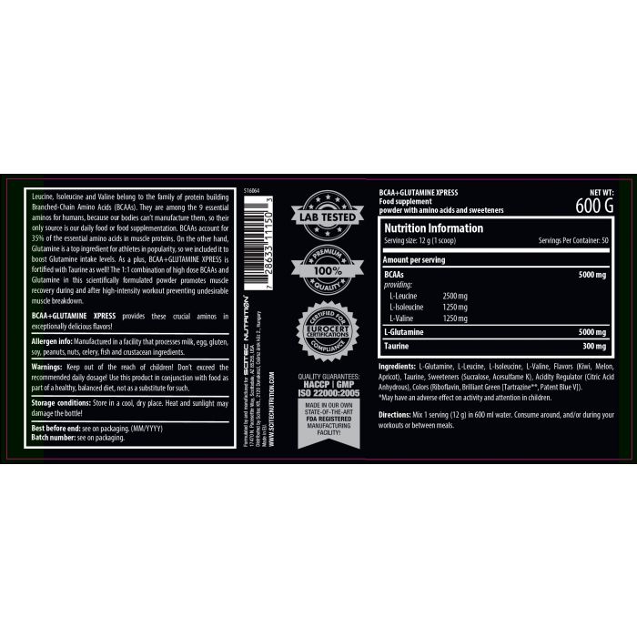 In Kreisen von Sportlern gehört Glutamin zu den beliebtesten Wirkstoffen. Daher darf es auch in dieser Formel nicht fehlen. Zusätzlich ist BCAA + GLUTAMINE EXPRESS mit Taurin angereichert. Die 1:1-Kombination aus einer hohen Dosis BCAA und Glutamin in diesem wissenschaftlich entwickelten Pulver hilft, die Muskeln während des Trainings mit hoher Intensität, aber auch nach dem Training zu regenerieren und verhindert so einen unerwünschten Muskelabbau.