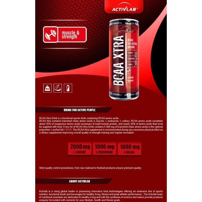 BCAA Xtra drink ist ein Getränk, das reich an BCAA, L-Leucin, L-Isoleucin und L-Valin ist und im Verhältnis 2:1:1 enthalten ist. Es enthält bis zu 4000 mg BCAA pro Dosis. Das Getränk beschleunigt die Muskelregeneration, wirkt antikatabol und reduziert Milchsäure. Es enthält keine Kohlenhydrate oder Fette.