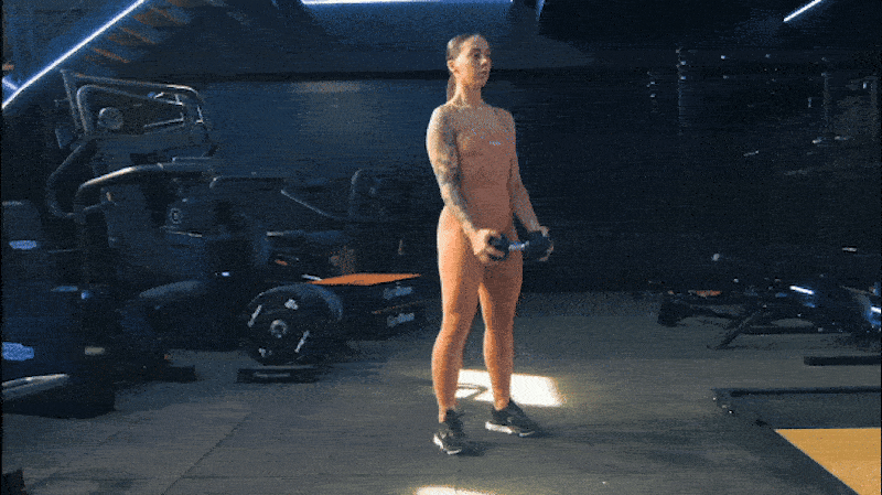 • Ausführung: Atme ein, während du deine Hüfte nach hinten und unten drückst und in die Hocke gehst, wobei du die Hantel vor deinem Körper hältst. Atme aus, während du sanft in den Stand zurückkehrst, indem du deine Gesäßmuskeln und die Vorderseite deiner Oberschenkel aktivierst. Anschließend machst du die nächste Wiederholung.