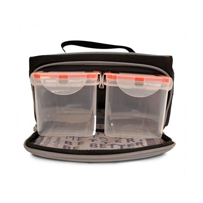 BOX SM Food Bag in schwarzer Farbe, in der Sie alle Ihre gesunden Lebensmittel in Boxen verpacken und überall mitnehmen können. Es ist ein revolutionärer Organizer für Ihre individuellen Gänge. Die Tasche ist tragbar und aus hochwertigem Material - 1000D Polyester. In der Packung sind zwei hochversiegelte Lebensmittelboxen und Kühlgels enthalten, um die Lebensmittel kühl zu halten.