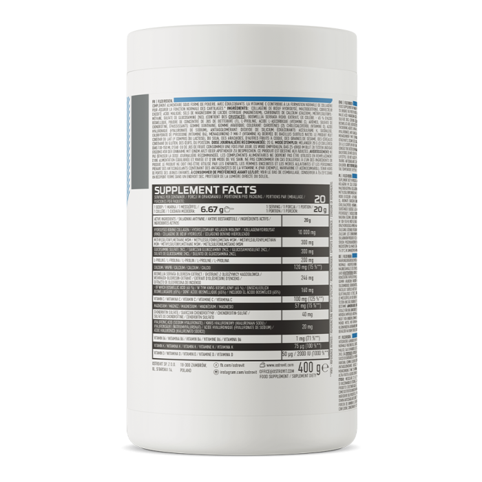 Das Produkt enthält einen Extrakt aus Sägepalme(Boswellia serrata), der mit der Pflege der Gelenkgesundheit in Verbindung gebracht wird. Aber auch Hyaluronsäure, die mit der Feuchtigkeit des Knorpels in Verbindung gebracht wird, sollte erwähnt werden. Als Nächstes kommt Kalzium, das das reibungslose Funktionieren der Muskeln unterstützt und zusammen mit Magnesium zur Erhaltung von gesunden Knochen beiträgt. Das Produkt enthält außerdem verschiedene Vitamine und Mineralstoffe, wobei vor allem Vitamin C hervorsticht. Es trägt zur normalen Bildung von Kollagen und der ordnungsgemäßen Funktion von Knochen oder Knorpel bei.Dieses Nahrungsergänzungsmittel wird von Sportlern, Liebhabern eines aktiven Lebensstils sowie von allen, die sich um ihren Bewegungsapparat kümmern wollen, geschätzt werden. Du kannst es mit Wasser, Saft oder deiner Lieblingslimonade mischen.