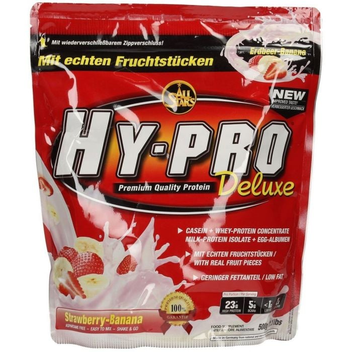 Hy-Pro 85 Deluxe ist ein Premium-Mehrkomponentenprotein aus 4 Proteinquellen: Kasein, Milchisolat, Molkenprotein und Eialbumin mit unterschiedlichen Absorptionszeiten, die eine lang anhaltende Versorgung mit Aminosäuren gewährleisten. Es enthält bis zu 80% Eiweiß, hat einen minimalen Fett- und Kohlenhydratgehalt. Es ist angereichert mit Fruchtstücken und Vitaminen.
