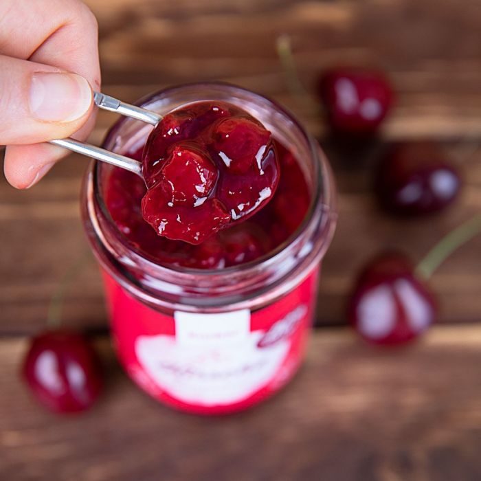 Kirschfruchtaufstrich hat 80% weniger Zucker als ähnliche Produkte, weil sie mit Xylit gesüßt ist. Sie enthält keine Konservierungs- oder Farbstoffe. Sie hat einen 74,8%igen Anteil an Kirschen, dank denen der echte fruchtige Geschmack hervorsticht. Die Konfitüre kann für die Zubereitung von Desserts oder als Aufstrich für Gebäck verwendet werden.