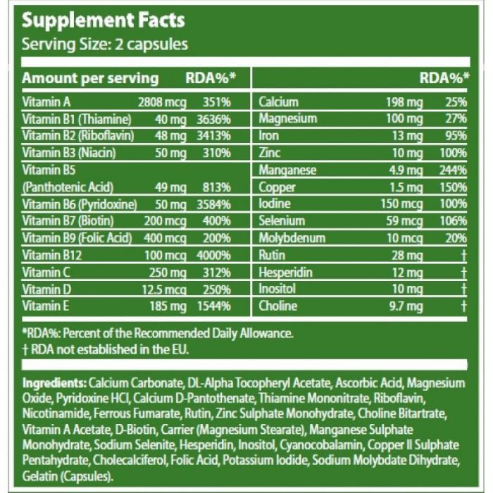 Calciumcarbonat, DL-alpha-Tocopherol, Ascorbinsäure, Magnesiumoxid, Pyridoxin-HCl, Calcium-D-Pantothenat, Thiaminmononitrat, Riboflavin, Nicotinamid, Eisenfumarat, Rutin, Zinksulfatmonohydrat, Cholinbitartrat, Vitamin-A-Acetat, D-Biotin, Magnesiumstearat, Mangansulfat-Monohydrat, Natriumselenit, Hesperidin, Inosit, Cyanocobalamin, Kupfersulfat-Pentahydrat, Cholecalciferol, Folsäure, Kaliumiodid, Natriumdihydrat, Gelatine (Kapseln).