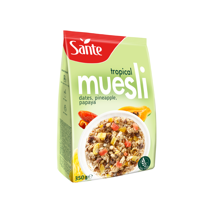 Tropisch: Getreideflocken 73% [Vollkorn-Haferflocken 32%, Gersteflocken, Weizen-flocken (Weizen, unraffinierter Rohrzucker, Meersalz, Gerstemalzextrakt), Maisflocken (Maisgrieß, unraffinierter Rohrzucker, Meersalz, Gerstenmalzextrakt)], eine Mischung aus Früchten 16% in verschiedenen Anteilen [getrocknete Datteln (Datteln, Reismehl), kandierte Ananas (Rohrzucker, Ananas, Säureregulator: Zitronensäure), kandierte Papaya (Rohrzucker, Papaya, Säureregulator: Zitronensäure)], Mehl (Gerste, Mais), Glukosesirup, unraffinierter Rohrzucker, ungehärtetes Palmfett, Maisgrieß, Rohrmelasse, Kokosflocken, Meersalz, Gerstenmalzextrakt, Zimt, Aromen.