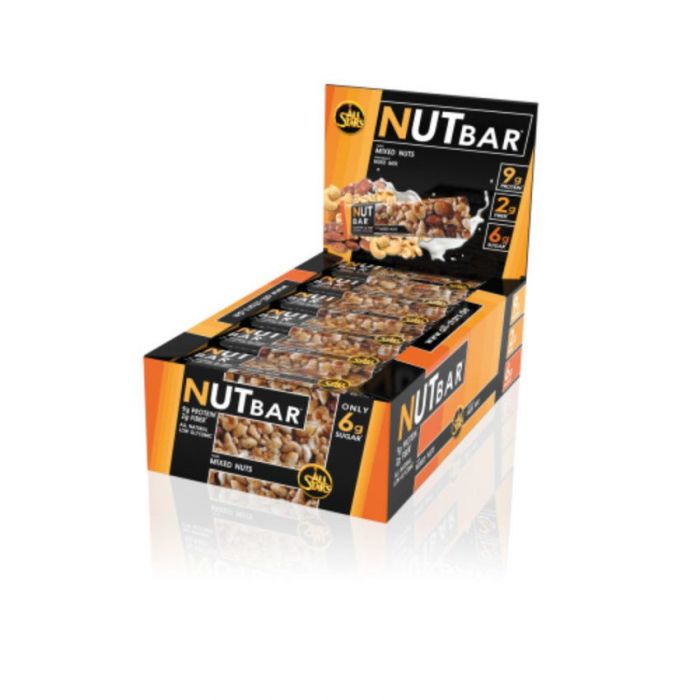 Nut Bar ist ein Nussriegel, der aus einer Mischung verschiedener Nüsse, Mandeln und Erdnüsse besteht. Dadurch enthält es bis zu 9 g Eiweiß, 4 g Ballaststoffe und gesunde Fette. Diese Bar ist ein ausgezeichneter Snack, ideal vor und nach dem Training sowie für Snacks zwischen den Mahlzeiten.
