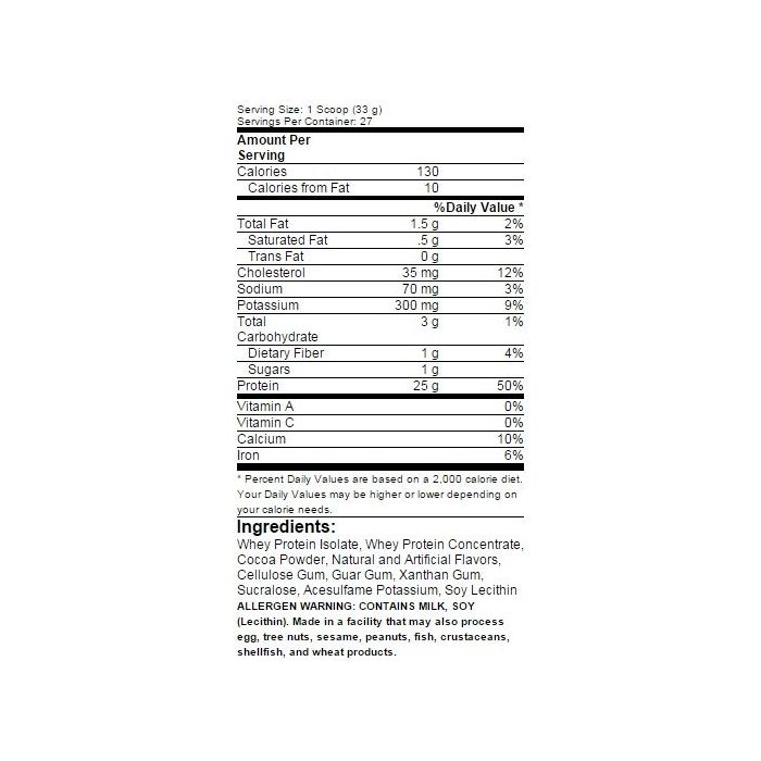 Molkenproteinisolat, Molkenproteinkonzentrat, Kakaopulver, natürliche und künstliche Aromen, Cellulosegummi, Guargummi, Xanthangummi, Sucralose, Acesulfam-Kalium, Sojabohnen-Lecithin.
