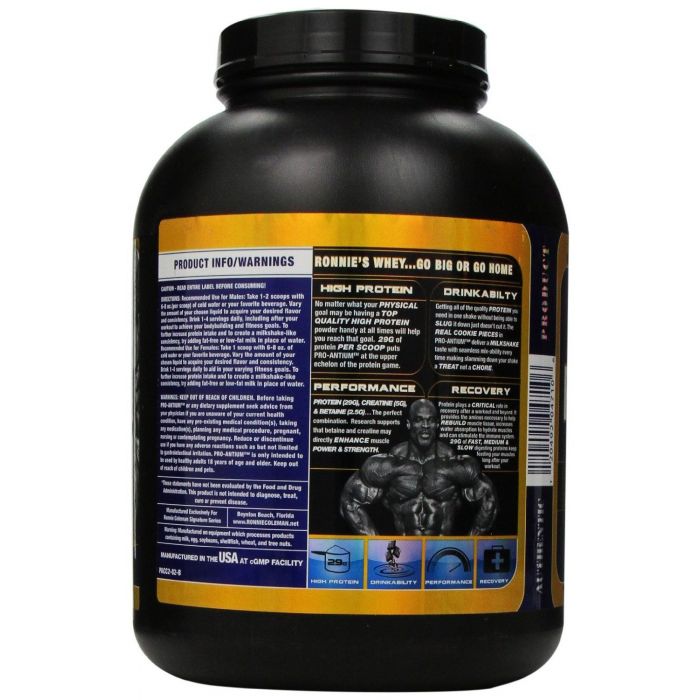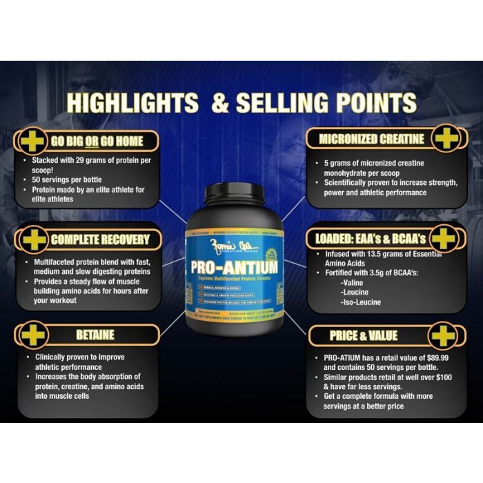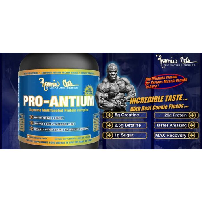 Pro-Antium-Protein ist ein Mehrkomponenten-Protein, das unglaubliche 29 g Protein in einer Einzeldosis liefert. Es wurde von Ronnie Coleman entworfen und er vergaß nicht die erhöhte Dosis an Kreatin, BCAA, Aminosäuren und wenig Zucker. Dieses Protein enthält bis zu 7 Arten von Proteinen, die schnell, mäßig schnell und langsam verdauen.