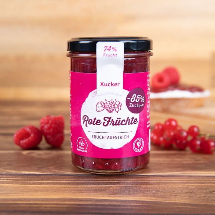 Rote Früchte Aufstrich hat im Vergleich zu ähnlichen Produkten 85% weniger Zucker, da er mit Xylitol gesüßt wird. Außerdem enthält er weder Konservierungsstoffe, noch Farbstoffe. Er enthält 74.5% Rote Früchte, welche ihm einen wahren Fruchtgeschmack verleihen. Der Fruchtaufstrich eignet sich perfekt für die Zubereitung deiner Desserts, oder als Brotaufstrich.