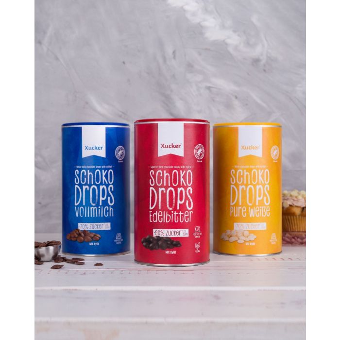 Drops aus weißer Schokolade sind Stücken der weißen Schokolade ohne zugefügten Zucker, die nur mit Xylit gesüßt werden. Xylit ist ein natürlicher Süßstoff mit niedrigen glykämischen Index und mit etwa der Hälfte des Zuckergehalts im Vergleich mit normalen Zucker. Die Schokostücke sind ideal beim Cookies, Muffins oder Kuchen backen, bei der Herstellung von hausgemachtem Müsli, aber auch für Porridge oder Joghurt.