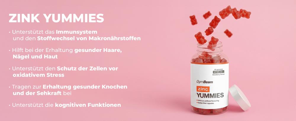 Zinc Yummies sind köstliche, erdbeeraromatisierte Gummis, die das Immunsystem sowie die richtige kognitive Funktion unterstützen